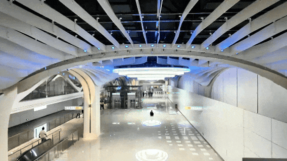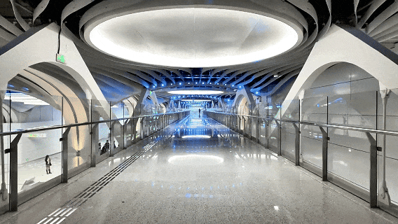 芳村站内极具特色的空中艺术廊桥,是为不进站乘车的市民提供的过街通道,相当于把地下人行通道融入地铁站之中。