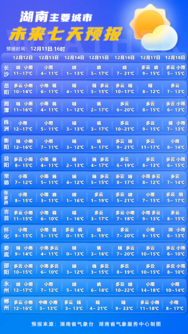 12日晚上至13日白天,湘南阴天有小到中雨,其他地区小雨转多云;北风4~5级减小到3~4级,局地阵风7~9级;最低气温3~7℃;最高气温10~13℃。