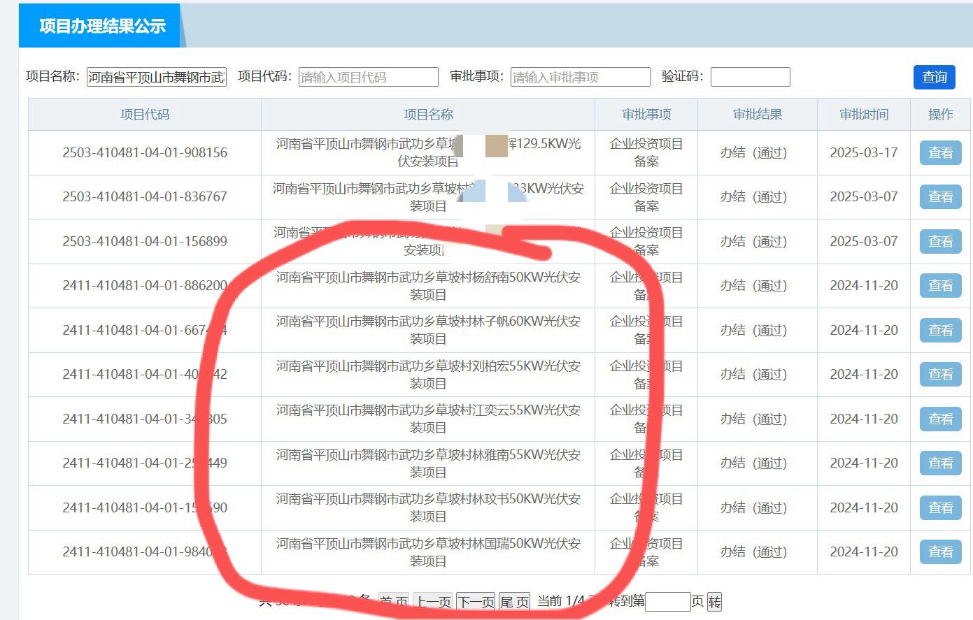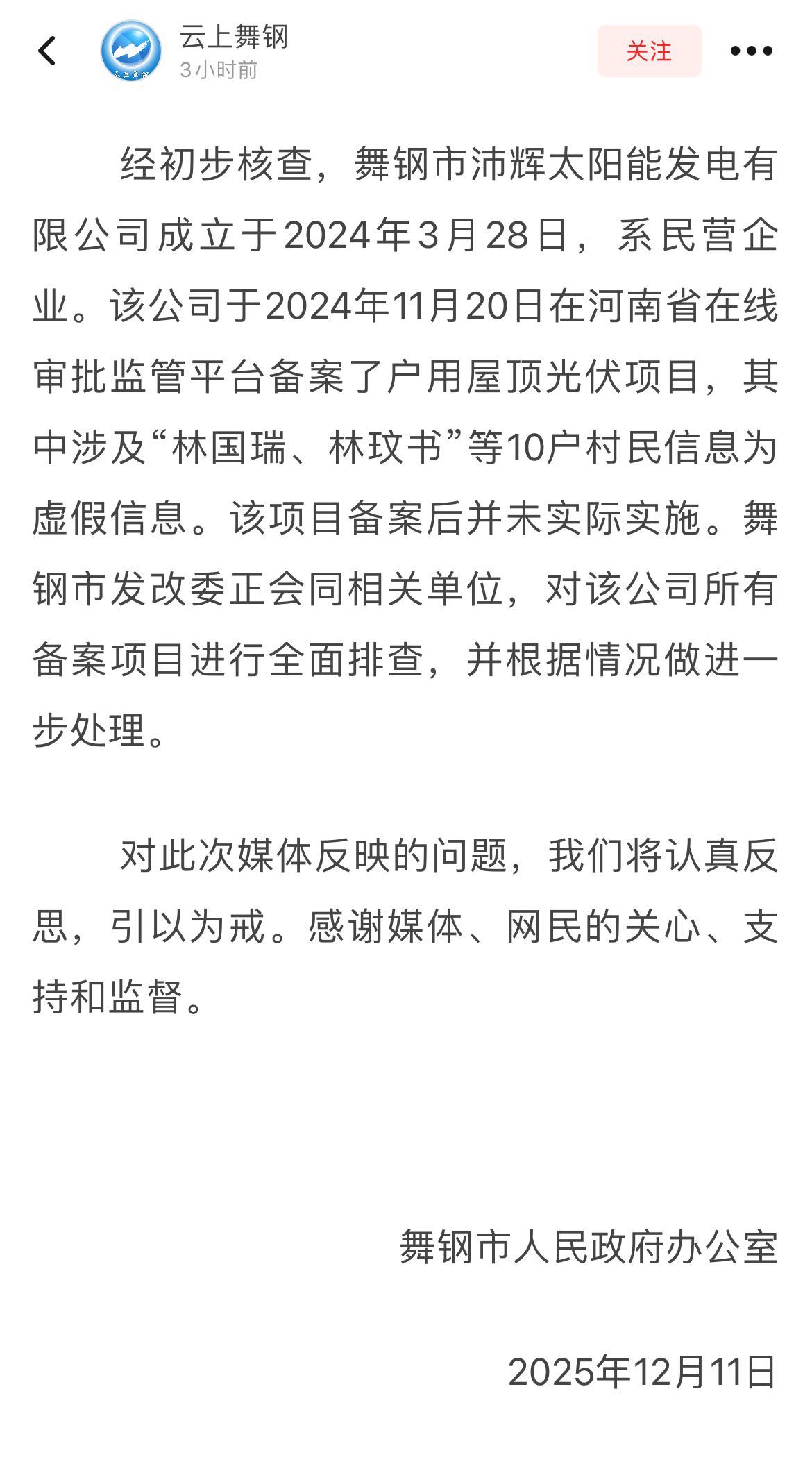 对此,舞钢市人民政府办公室发布情况通报。经初步核查,舞钢市沛辉太阳能发电有限公司成立于2024年3月28日,系民营企业。该公司于2024年11月20日在河南省在线审批监管平台备案了户用屋顶光伏项目,其中涉及“林国瑞、林玟书”等10户村民信息为虚假信息。该项目备案后并未实际实施。舞钢市发改委正会同相关单位,对该公司所有备案项目进行全面排查,并根据情况做进一步处理。