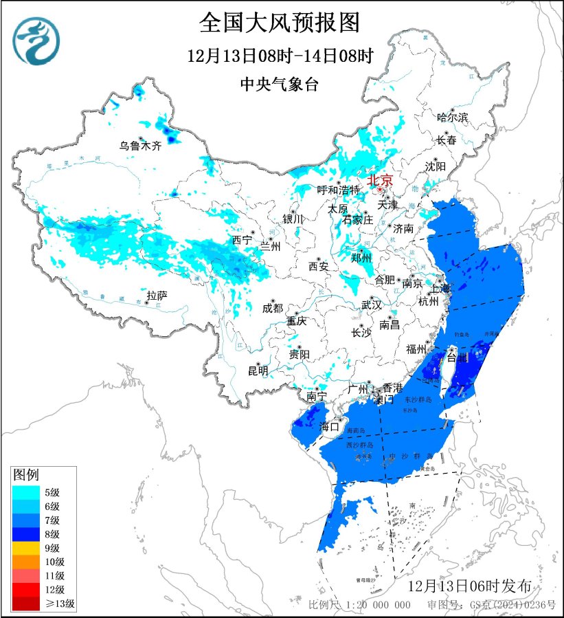 预计,12月13日08时至14日08时,新疆北部、青海东部和南部、西藏北部、川西高原北部、内蒙古中部、华北西部和北部、黄淮西部、山东半岛、辽东半岛等地部分地区有5~6级、阵风7~8级的大风,其中,新疆山口地区阵风可达8~9级;黄海大部海域、东海大部海域、台湾海峡、台湾以东洋面、巴士海峡、南海北部和中部海域、南海西南部海域、北部湾将有7~8级、阵风9级的大风,其中台湾海峡、台湾以东洋面的部分海域风力可达9级、阵风10级。