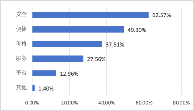 调查结果显示,超六成(62.57%)受访者将安全作为选择网约车的首要关注因素,占比明显高于便捷性(49.30%)和价格(37.51%)。说明安全已成为超越便捷与价格的需求,是平台建立信任的核心基础。