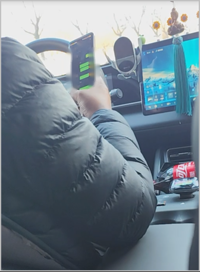 报告体验调查图:某位网约车司机边开车边刷微信。
