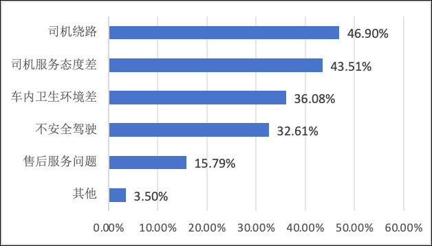 在选择网约车时,消费者对服务风险高度敏感。受访者最担心遇到的问题包括“司机绕路”(46.90%)和“司机服务态度差”(43.51%)。而在实际消费过程中,消费者最常遇到的则是“不合理收费”(38.35%)和“系统定位不准”(33.25%)等运营层面问题。