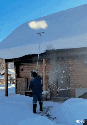而在阿勒泰等积雪更厚的地方,雪没法扫,只能“打”,用工具重重敲一下屋檐,雪块便像奶油瀑布一样止不住地往下落,蔚为壮观。