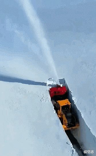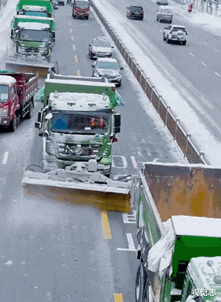 由于雪实在太厚,为了提升效率,新疆的扫雪车总会摆出整齐划一的姿态,以相同的速度横扫街面上的积雪。远远望去,仿若一支训练有素的仪仗队,堪称“强迫症患者的福音”。