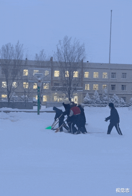 即便是还在上学的孩子,亦是这场全民扫雪运动的一份子,每个学校都会安排轮值的扫雪小组,他们必须天不亮就到校,在昏黄路灯下,合力开辟出一条上学的通道。