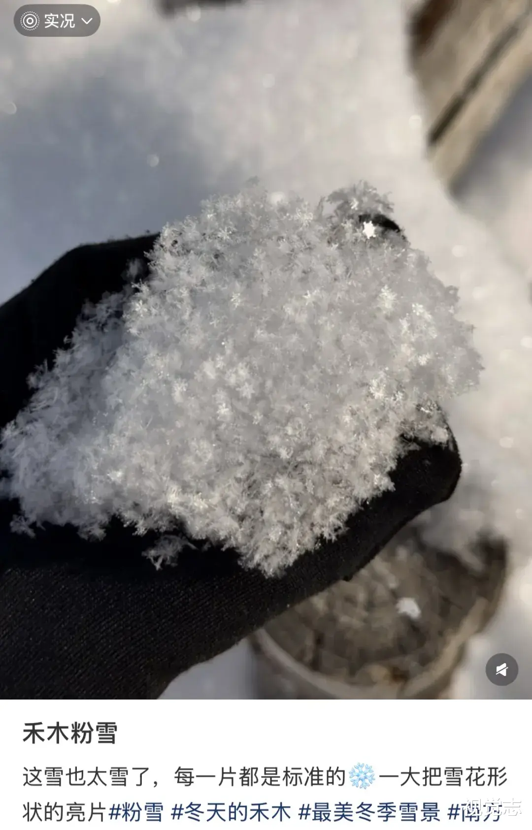 有游客将路边的雪捧起,发现卧在掌心的不是一捧“雪白的细沙”,而是一片片晶莹剔透、泛着亮光的“六角形结晶花瓣”,梦幻且浪漫。