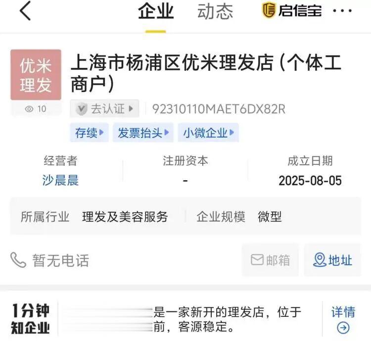2025年8月5日,同一地址成立了上海杨浦区优米理发店。在简介中,企业主介绍了该店与前述三匠Salon之间的关系:“三匠美发是一家新开的理发店,位于大学路,排名靠前。”目前,优米理发店的经营状态处于存续状态。目前,该地址理发店的实际经营商户,即本次事件的责任主体,为上海市杨浦区优米理发店。