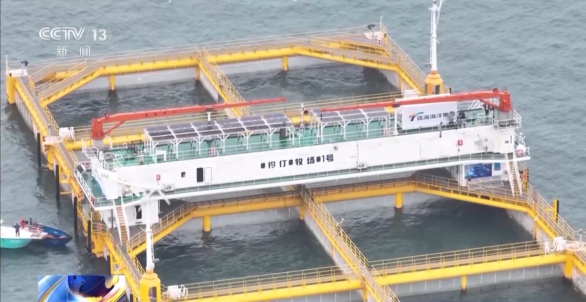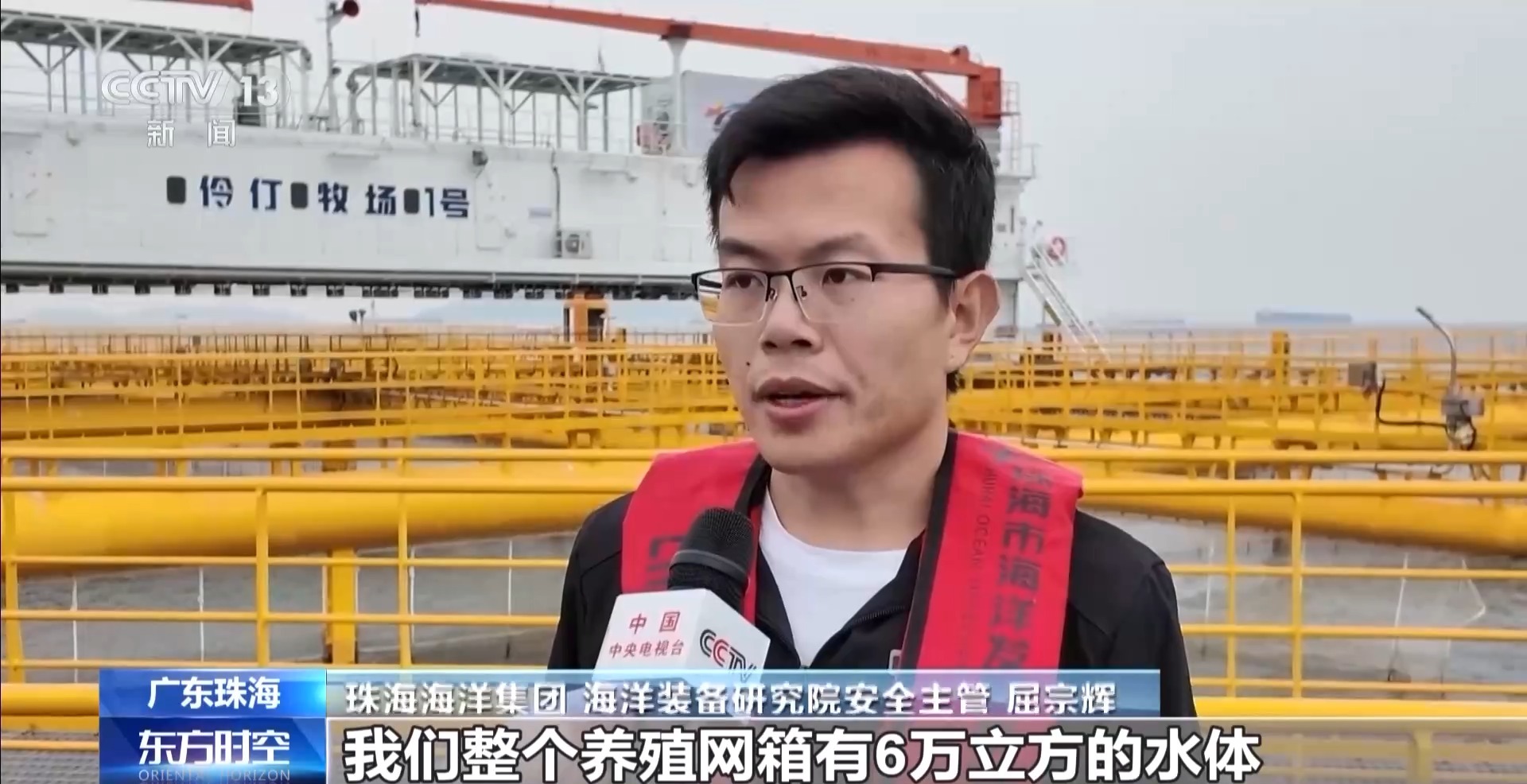 珠海海洋集团海洋装备研究院安全主管屈宗辉:整个养殖网箱有6万立方的水体,只需要6到8人就可以做到,相较于同样产出的重力式网箱,节约人力成本50%到70%。