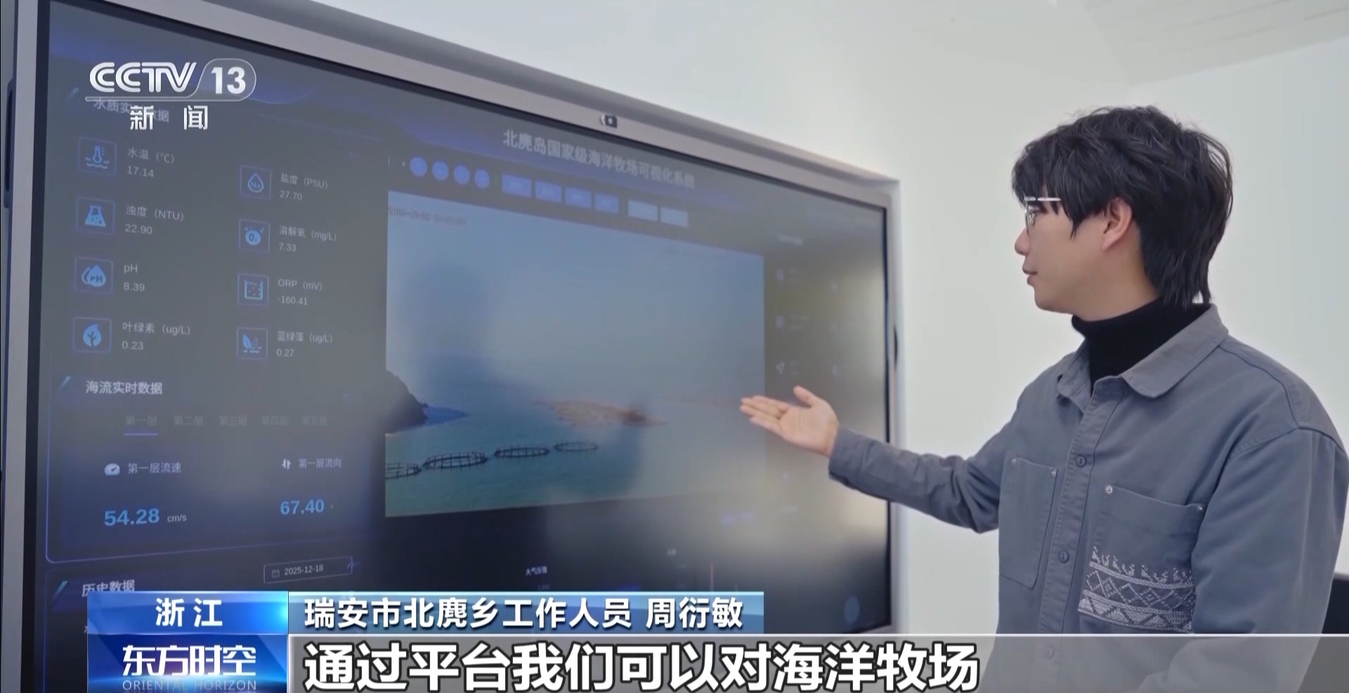 瑞安市北麂乡工作人员周衍敏:通过平台,我们可以对海洋牧场所在海域的实时影像、水下影像、气象、水质进行全方位的监测,确保海洋生态养护效果。