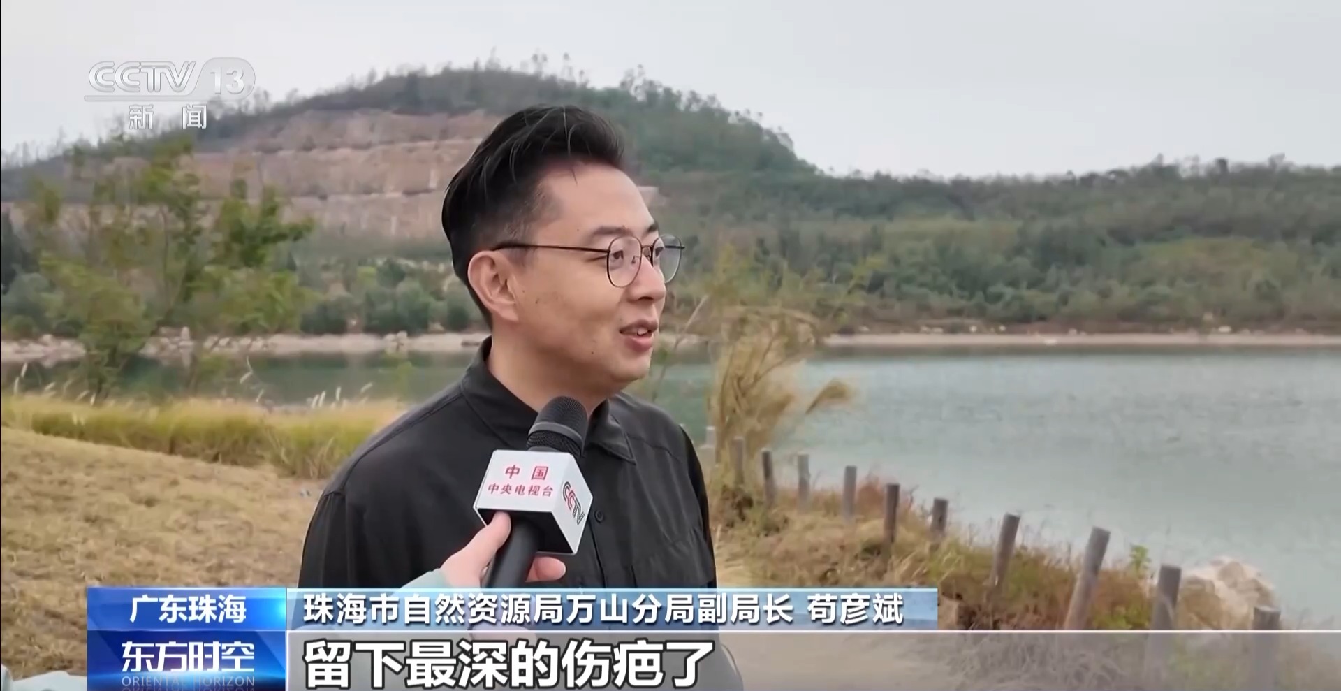 珠海市自然资源局万山分局副局长苟彦斌:之前它是一个很深的矿山开采的矿坑,可以说是之前三角岛留下最深的伤疤了。但是现在把海水淡化成淡水,注入湖泊里面,已经形成了天然矿湖的形态。