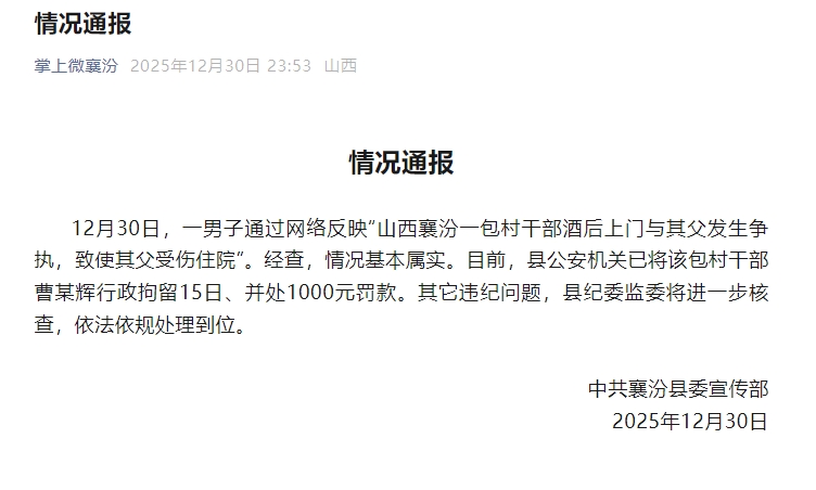 新京报讯据掌上微襄汾消息,12月30日,一男子通过网络反映“山西襄汾一包村干部酒后上门与其父发生争执,致使其父受伤住院”。经查,情况基本属实。目前,县公安机关已将该包村干部曹某辉行政拘留15日、并处1000元罚款。其它违纪问题,县纪委监委将进一步核查,依法依规处理到位。