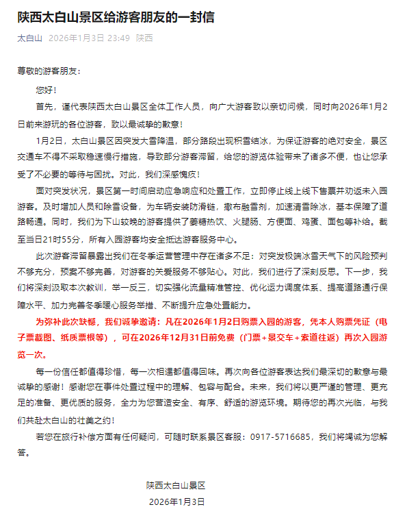 首先,谨代表陕西太白山景区全体工作人员,向广大游客致以亲切问候,同时向2026年1月2日前来游玩的各位游客,致以最诚挚的歉意!