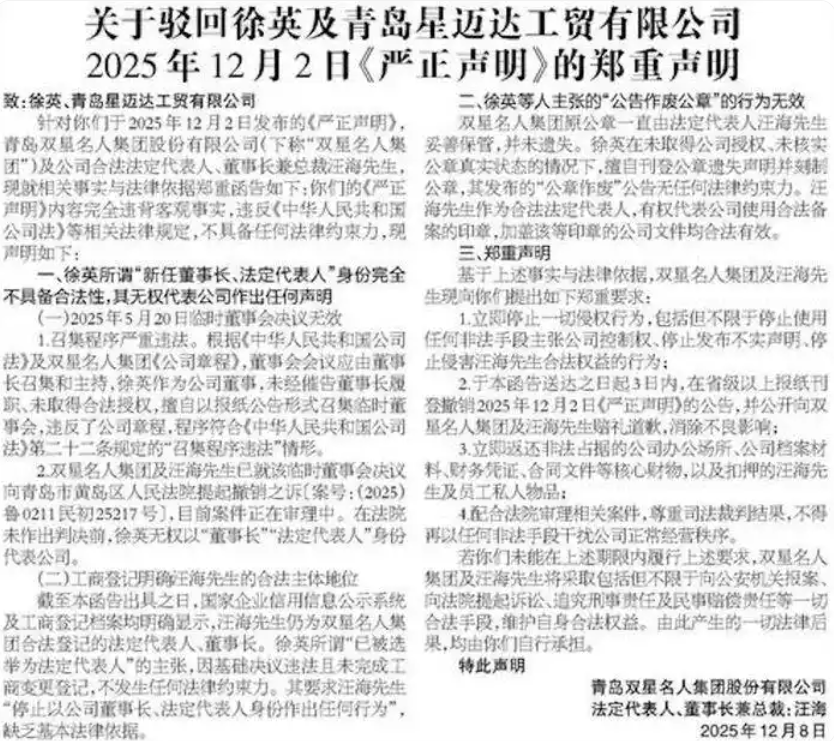 2025年12月,双方就“合法代表”“公章有效性”公开交锋。12月2日徐英发声明,以5月董事会决议为依据,指控汪海拒不变更执照、私刻印章,否定其用私章签署文件的效力;6天后汪海登报驳斥,直指5月临时董事会召集程序违法,决议无效,强调原公章由自己妥善保管,要求徐英登报道歉并退还公司档案等资料,同时透露已就该董事会决议提起撤销之诉,案件正在审理中。