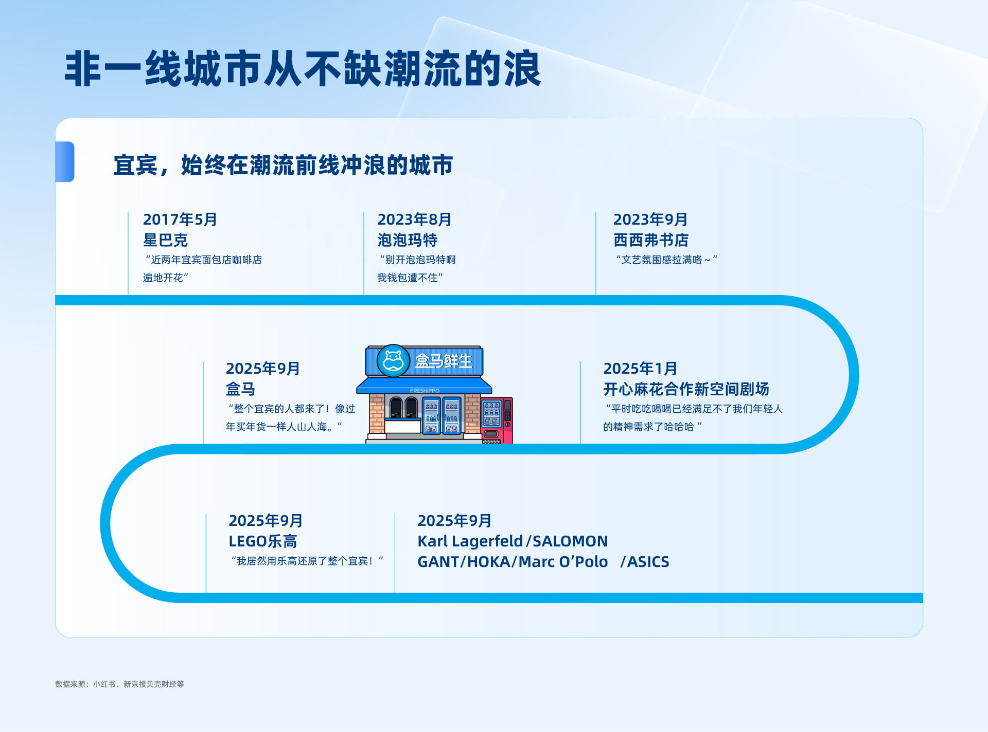 类似的变化也发生在其他中高端零售业态中。2025年,盒马鲜生共进驻40个新城市,在山东临沂连续开出两家门店,从首次进入到快速复制仅间隔一个月。在实体书店经营普遍承压的当下,西西弗书店在三线城市扬州布局3家门店,在四线城市宜宾也已开出2家,开店密度接近部分二线城市水平。同时,“中产三件套”之一的户外品牌Salomon(萨洛蒙)、潮玩品牌泡泡玛特等品牌,也相继进入更多新兴城市。