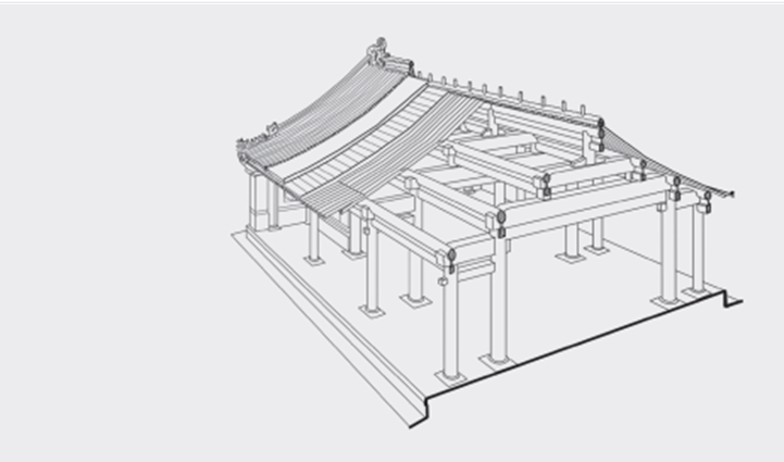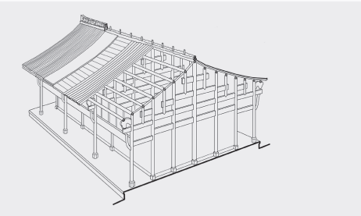 在本书中,我们将典型抬梁构架的屋架——即水平梁木金字塔形层层相叠相退的结构——称作“叠梁屋架”。将典型抬梁构架的屋架之下,柱子与水平构件(梁、额)形成的构架,称为“柱梁构架”。如此,我们便在唐以前的早期结构中彻底回避了“抬梁”一词。当我们使用“抬梁”时,均指唐代之后叠梁屋架与柱梁构架形成的“成熟”的结构体。