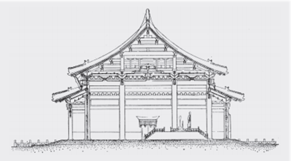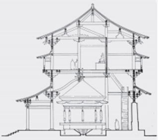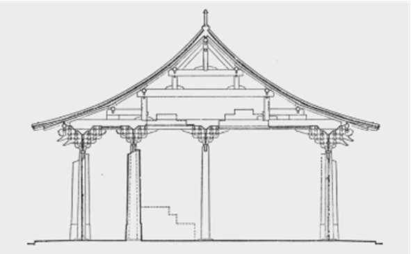 由此小结,汉至北朝之间,最盛行的结构是叉手结构即三角构架,其跨度能力至少可达四椽。叠梁屋架或抬梁结构随着建筑进深的增大而出现,最初可能是多层三角构架相叠,这便已经出现了上下相叠的水平梁木,并出现了用叠梁肢解、取代叉手屋架的可能性。随后,叠梁与被“肢解”的叉手(顶层叉手与下层托脚)曾在一定时期之内并存。随着叠梁势力的扩大,托脚率先消失,叉手逐渐细弱,最终消失。叠梁成为屋顶结构的主人。
