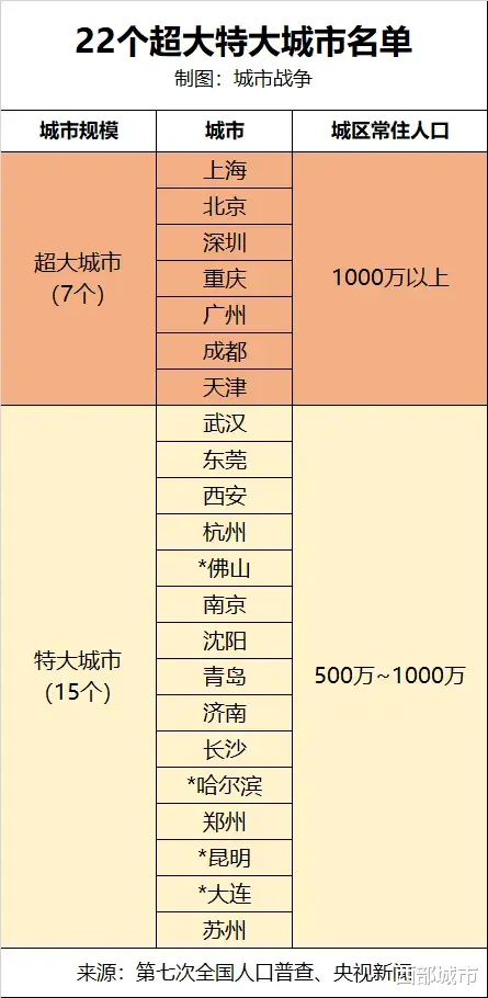 比如,根据第七次人口普查数据,超大城市应该为7个: