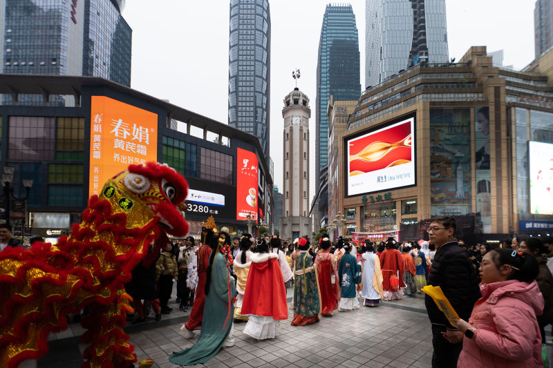 《狮影伴华裳》2025年1月17日,摄于重庆市渝中区解放碑迎春活动。
