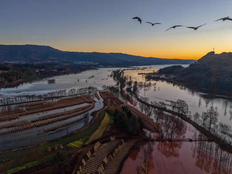 《黎明鹤影》2025年12月15日,摄于云南省曲靖市念湖。