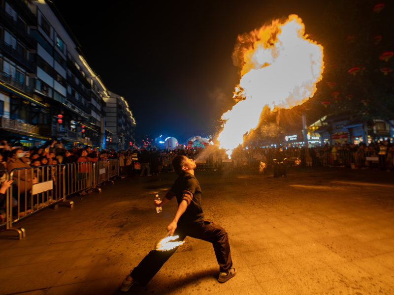 《喷火表演》2025年1月19日,摄于重庆磁器口景区。