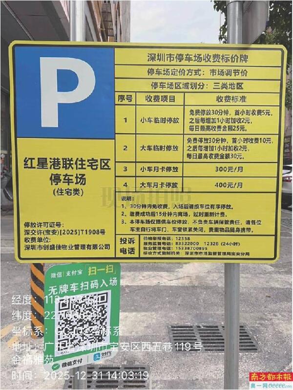 对此,属地管理部门宝安区松岗街道办作出了回应。据介绍,红星港联住宅区为深圳市松岗红星股份合作公司集体用地,已委托深圳市创盛佳物业管理有限公司对该集体用地实施围合式停车规范管理,已于2025年11月27日取得《深圳市经营性停车场许可证》[深交许(宝安)[2025]T1908号]。