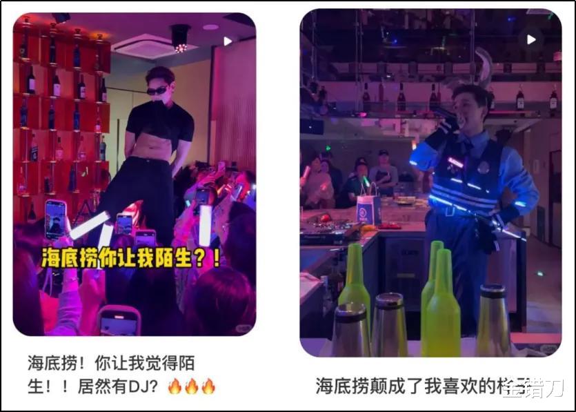 开头提到的“夜店”就是一个典型。海底捞请来腹肌猛男打碟,上演制服诱惑与男仆舞姿,一些门店还提供1V1调酒服务,情绪价值拉满。