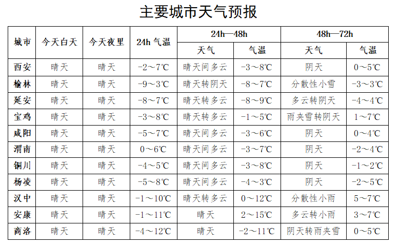 25日:全省多云间阴天,陕北北部有分散性小雪(0~1毫米),关中西部和北部局地、关中平原南部、秦巴山区有雨夹雪或小雪(0~1毫米)、陕南河谷地区有小雨或雨夹雪(0~1毫米)。陕北、关中、秦巴山区有4级左右风,阵风可达6级以上。日平均气温陕北、关中、陕南西部下降4℃左右。