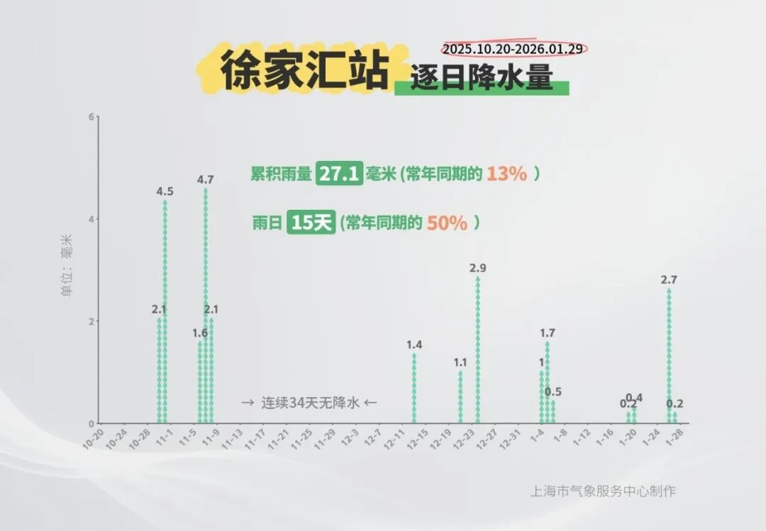 2025年10月20日至2026年1月29日,上海累积雨量27.1毫米,仅常年同期的13%;雨日有15天,为常年同期的50%,其中连续34日无降水。