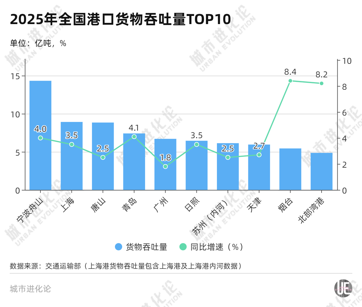 此外,2025年全国主要港口货物吞吐量前十名为:宁波舟山港、上海港、唐山港、青岛港、广州港、日照港、苏州港、天津港、烟台港、北部湾港。其中,烟台港货物吞吐量增速8.4%,在十强港口中排名第一;北部湾港增速8.2%,排名第二。