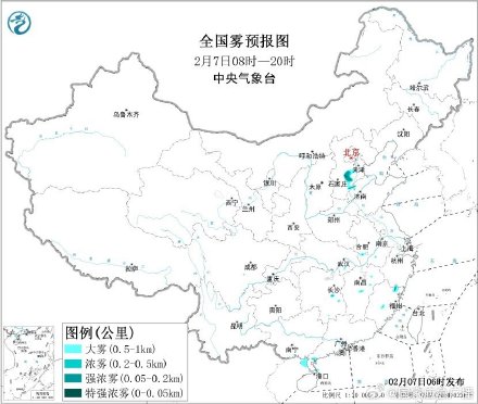 预计,2月7日白天,北部湾北部沿岸等海域有能见度不足1公里大雾;早晨至上午时段,河北中部、山东西北部等多地部分地区有大雾,河北中部局地现能见度不足50米的特强浓雾。