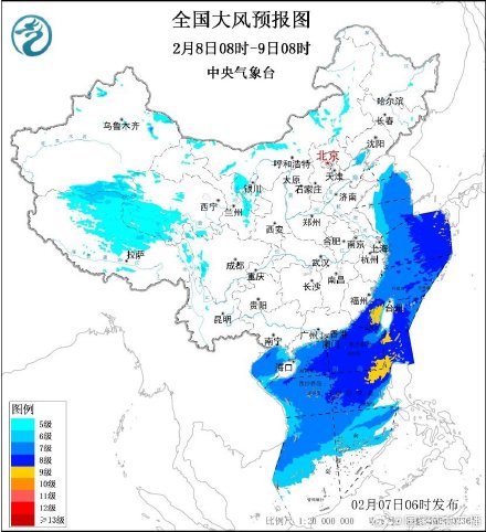 预计,7日08时至8日08时:新疆北部和东部、甘肃西部等多地有5~6级风,阵风7~8级;渤海、黄海大部等海域有7~8级、阵风9级大风,东海北部等部分海域风力可达9级、阵风10级。8日08时至9日08时:新疆东北部、内蒙古中西部等多地有5~6级风,阵风7~8级;黄海中东部、东海等海域有7~8级、阵风9级大风,东海北部等部分海域风力可达9级、阵风10级。