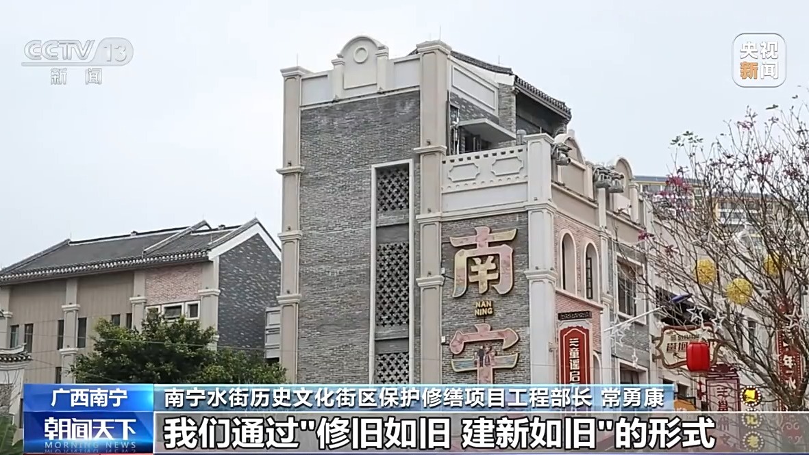 南宁水街历史文化街区保护修缮项目工程部长常勇康:建设过程中我们通过“修旧如旧、建新如旧”的形式,对原有两处文保单位进行修缮加固,雕花窗棂、彩绘装饰等均依据历史照片与建筑残迹,由手艺传承人逐一进行手工修复、重绘,最大限度还原历史原貌。