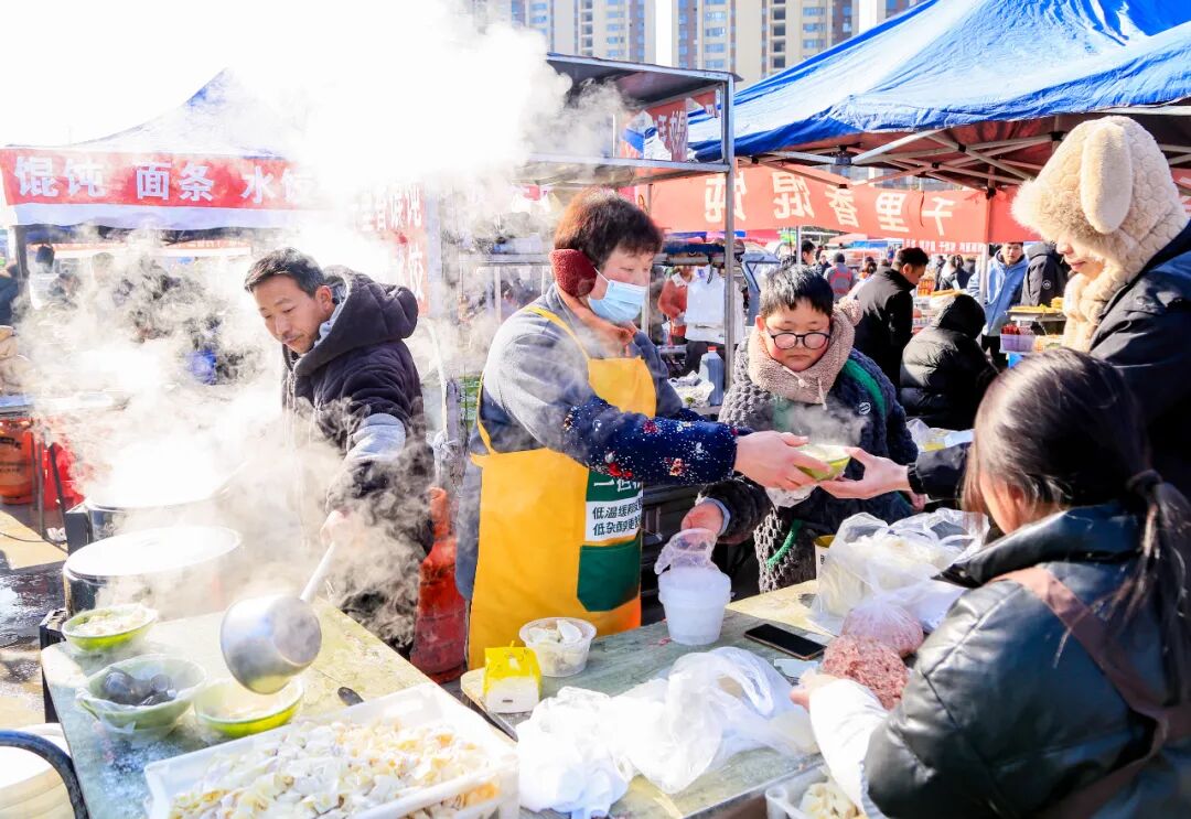 比如在山东潍坊的望留大集,早上天刚蒙蒙亮,商贩们就早已前来出摊。伴随着太阳冉冉升起,大集上前来置办年货的市民逐渐多了起来。各式各样的货品琳琅满目,叫人目不暇接,瓜果蔬菜、鸡鸭鱼肉、特色小吃、衣帽服饰等应有尽有。