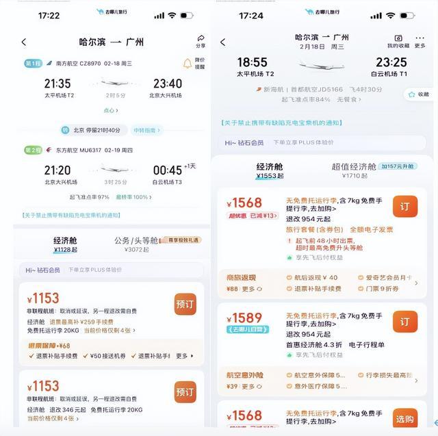 比如大年初二从哈尔滨到广州,在北京中转停留21小时的超长中转航班,机票价格比直飞便宜400元。在去哪儿平台上,这类转机时间超过12小时、票价比直飞更低的超长中转航班,预订量同比去年增长了三成。