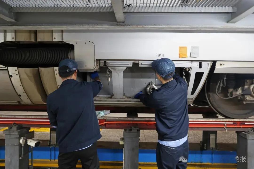 当晚8时28分,该趟复兴号动车组列车驶入南宁动车所检查库,地勤机械师严芝科和搭档张浩早早就备好了工具材料,等候在一旁。