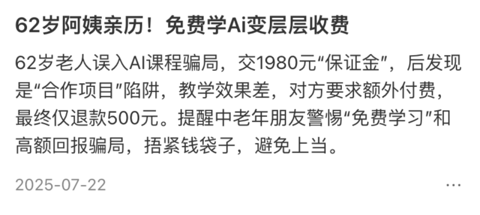 “AI课程在家自学”“0学费”“月入过万的副业”“只需手机”等标签,条条都戳中在家无事、又想为退休金创收的老年人的敏感神经。