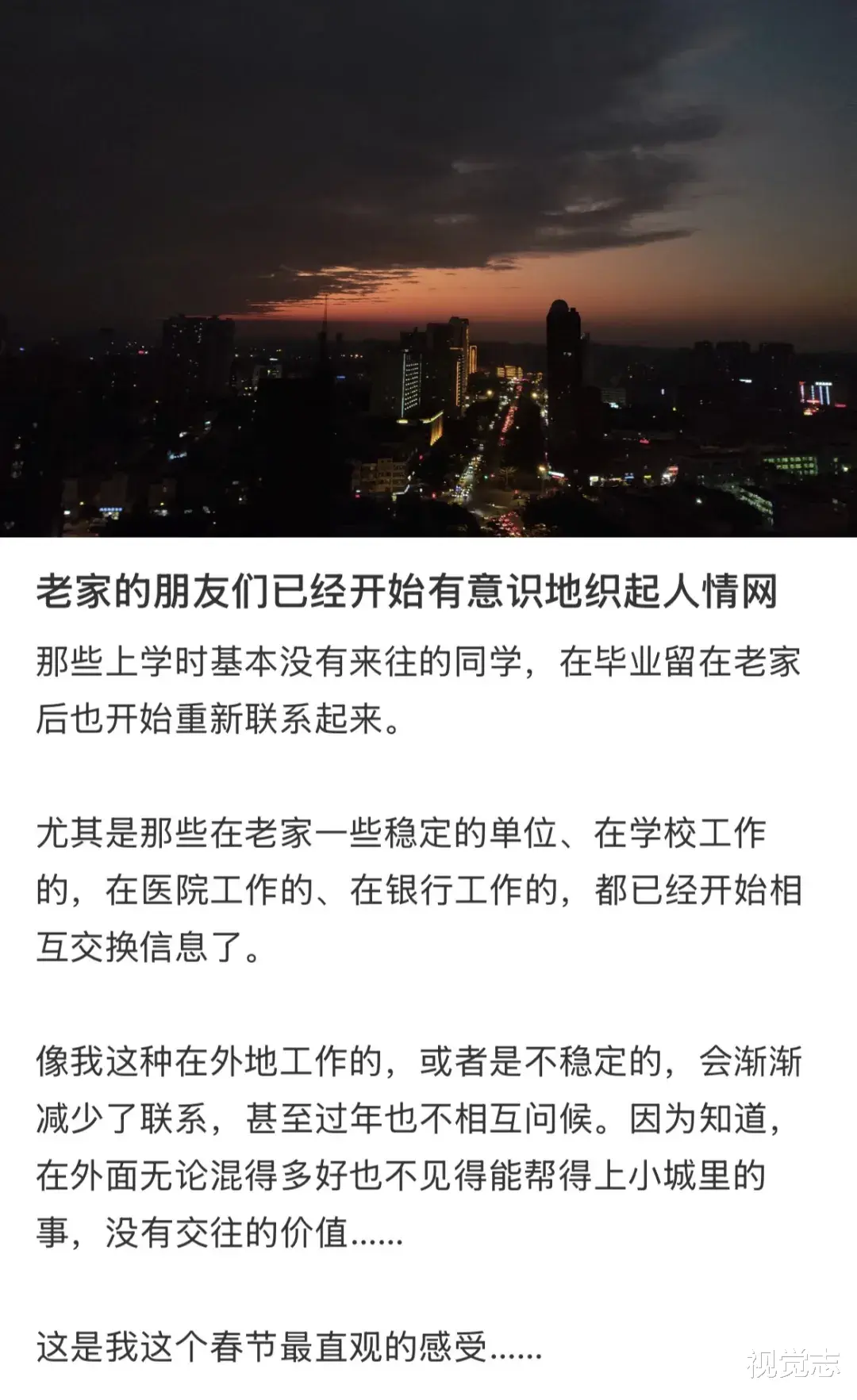 就连同学聚会也成了关系置换的社交场合,人们不再回忆往昔,而是交换起了工作岗位,攀谈起了人情往来。至于从大城市回来的自己,则显得有些格格不入。