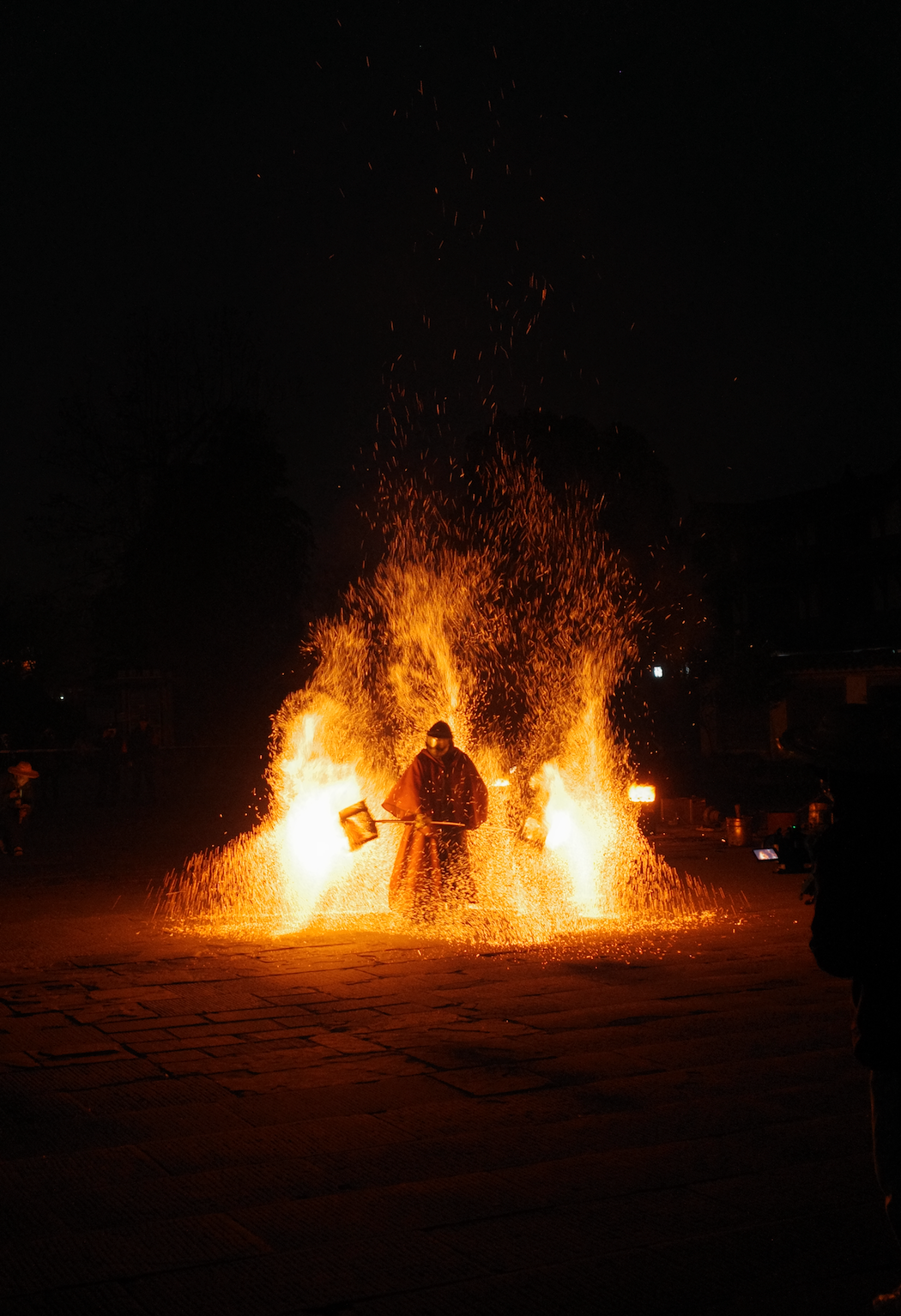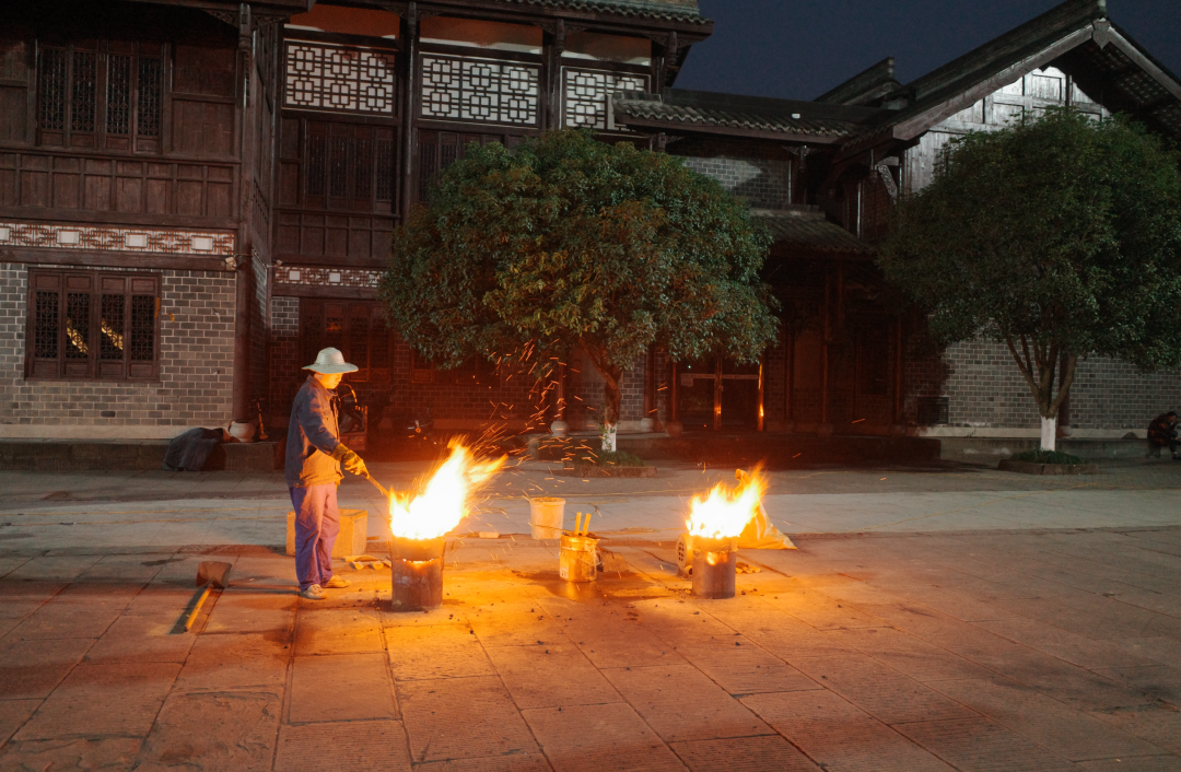 几个小时之后,古镇的广场上就要迎来一场盛大的表演:以装满炭火的火壶开场,到舞龙、打铁花,再到最后的风火轮收尾。光转之间,上演一出“东风夜放花千树”的大戏。