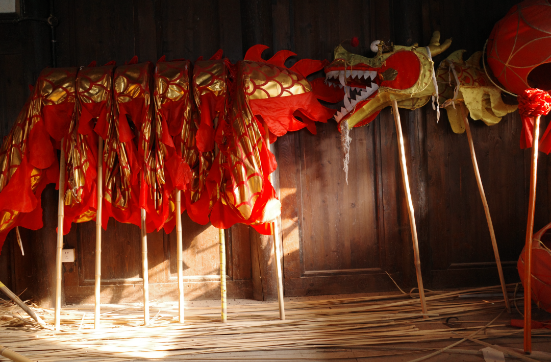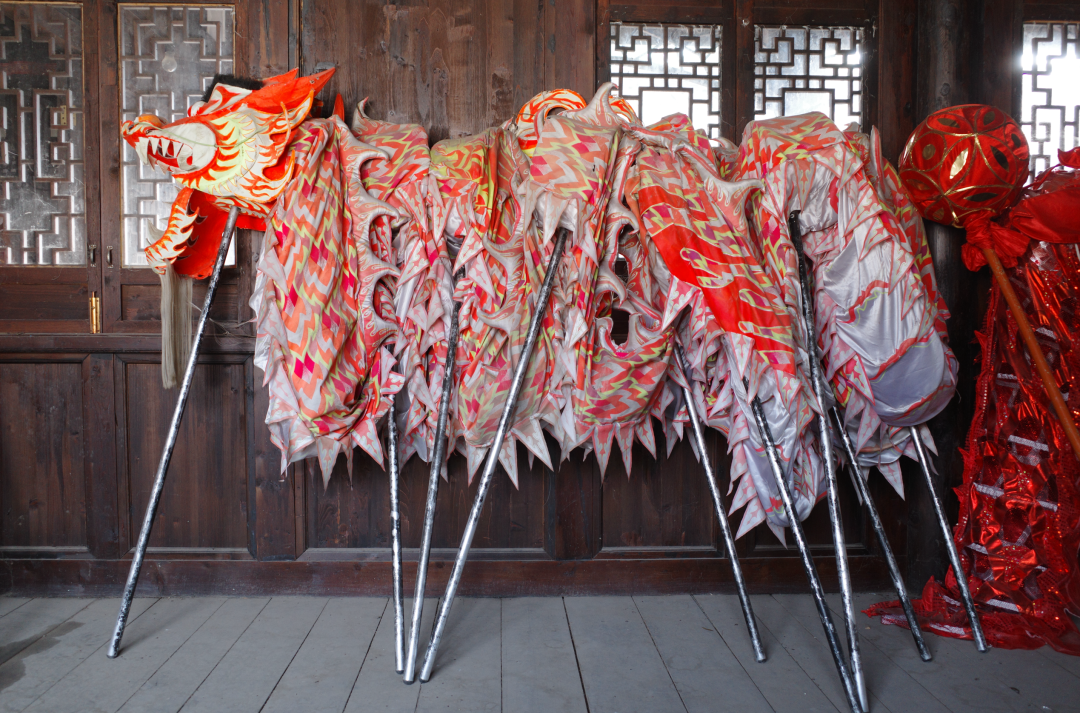 本地的阿姨们坐在青石板街旁嗑着瓜子,享受着阳光。头顶数盏红灯笼,满满新年的气氛。火龙灯舞的训练基地并不好找,直到七扭八拐之后,一座仿清建筑出现在街尾。