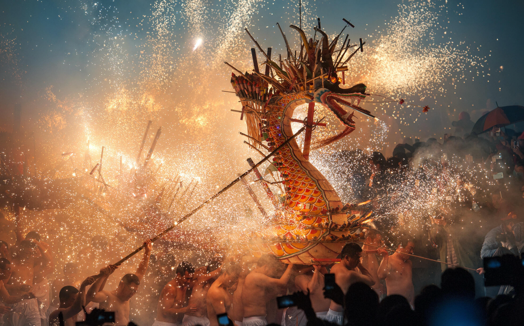 星火之间,一条“龙”在火中穿行。