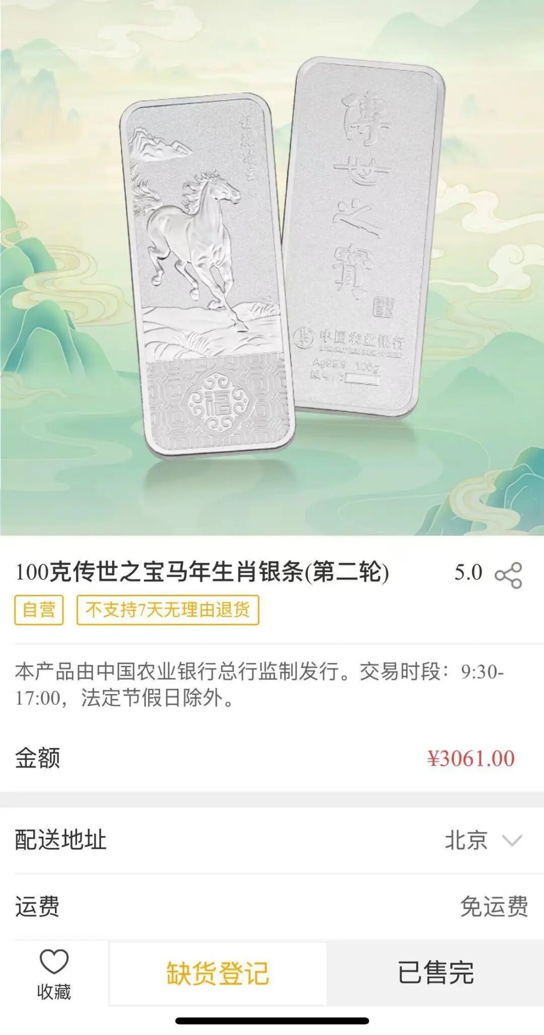 不仅金条抢手,该行3克“传世之宝鸿福有余银鱼”和100克“传世之宝马年生肖银条”也显示已售完,足见当前贵金属投资之热。