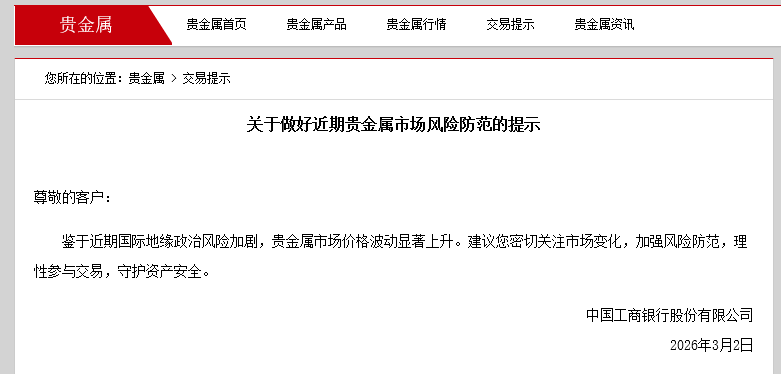 3月2日,工商银行发布《关于做好近期贵金属市场风险防范的提示》称,鉴于近期国际地缘政治风险加剧,贵金属市场价格波动显著上升,建议客户密切关注市场变化,加强风险防范,理性参与交易,守护资产安全。