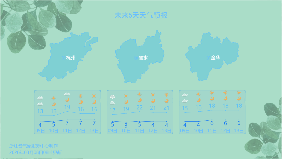 在西南暖湿气流的影响下,今明我省云量还是比较多的,其中浙中南地区还会飘些小雨。好在天气正逐渐向好的方向发展,明天浙中南地区的小雨开始渐渐收场切换为阴天。