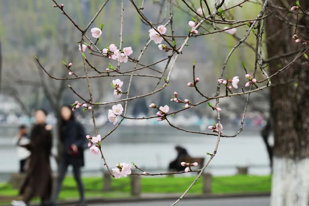 西湖白堤桃花初开。里尔摄