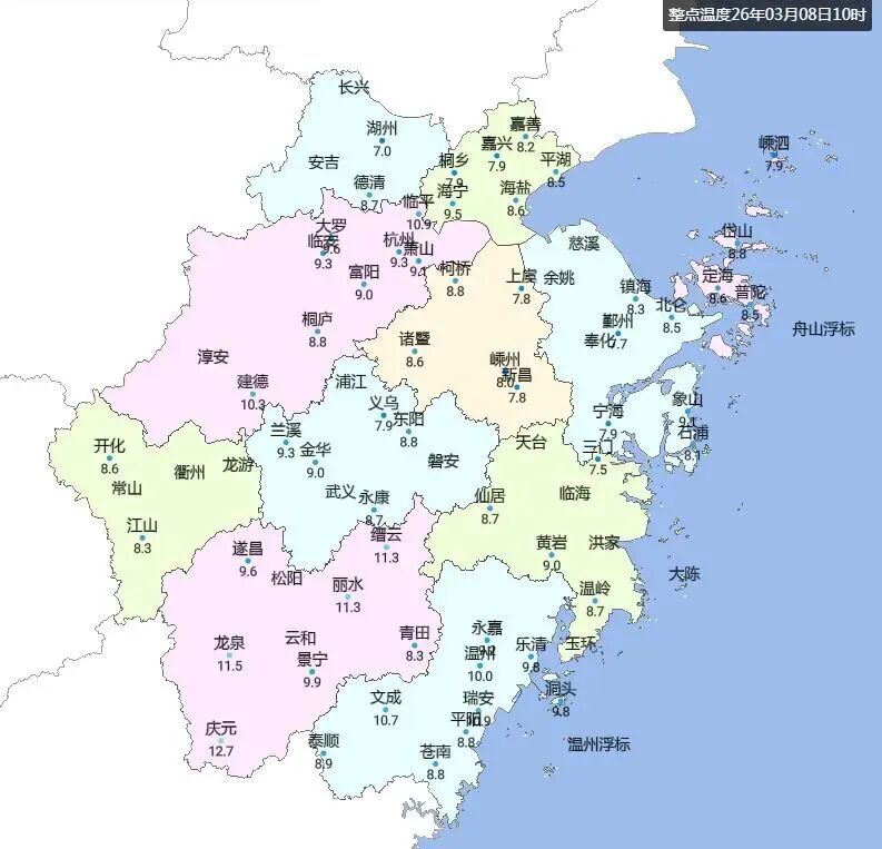 没有了慷慨的阳光,气温爬升很慢,10时全省大部相比早晨的最低气温并没有爬升多少,尤其是浙中北地区,大部还在10℃以下。