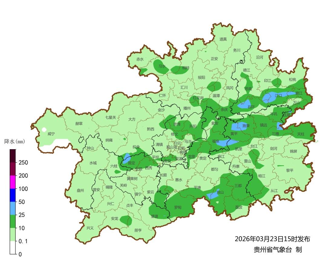 今天午后到夜间,省的西部多云有分散阵雨或雷雨,东部地区阴天有阵雨或雷雨,其余阴天间多云有阵雨或雷雨,铜仁市南部、贵阳市南部、安顺市东部、黔南州及黔东南州中南部局地中到大雨,个别乡镇有暴雨,中南部地区局地有雷暴大风、冰雹及短时强降水等强对流天气;24日白天,全省阴天间多云有分散阵雨或雷雨;