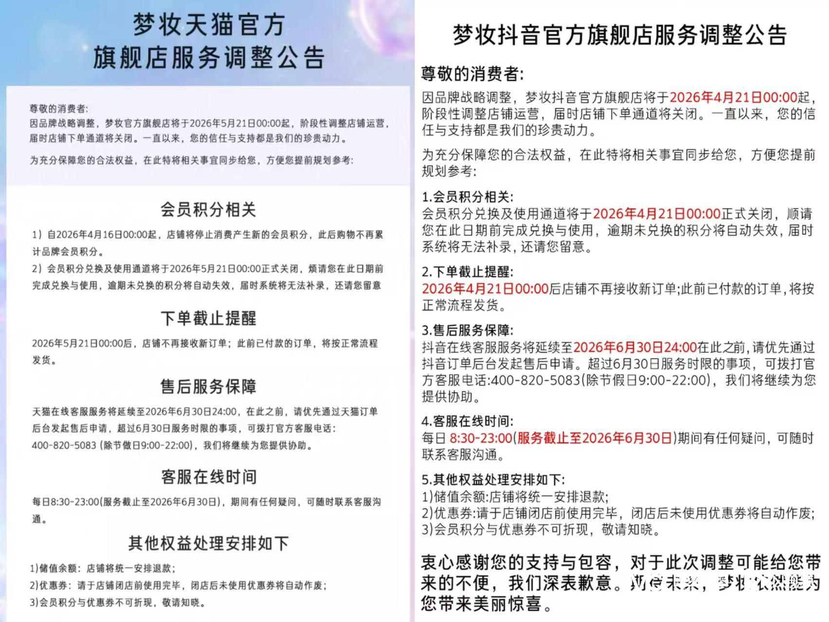 梦妆中国官方账号发布公告称,“因运营策略调整,梦妆中国大陆官方社交媒体账号,于2026年3月31日正式停止运营。”同时,梦妆宣布,在中国的线上官方销售渠道(如官方商城、电商平台旗舰店)将服务至2026年6月30日正式关闭。此后,可以在品牌海外常规购买渠道了解梦妆产品信息。