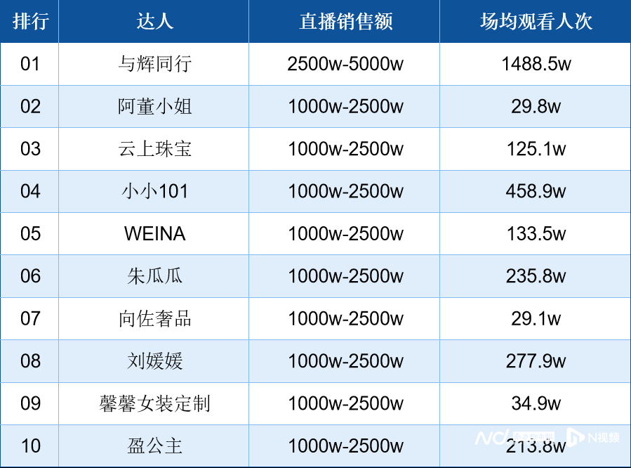抖音3月31日直播带货日榜:与辉同行稳居第一,销售额超2500万;第2名到第10名,销售额全部集中在1000万—2500万区间,涵盖珠宝、女装、美妆、综合等品类。