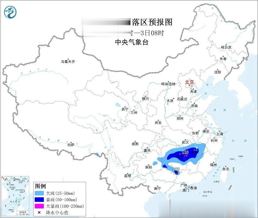 中央气象台4月2日06时发布暴雨蓝色预警:预计,4月2日08时至3日08时,贵州东部、湖南大部、江西中北部、广西东北部、广东西北部等地部分地区有大到暴雨,其中,湖南南部、江西西部等地局地有大暴雨(100至120毫米)。上述部分地区伴有短时强降水(最大小时降雨量20至40毫米,局地可超过50毫米),局地有雷暴大风、冰雹等强对流天气。